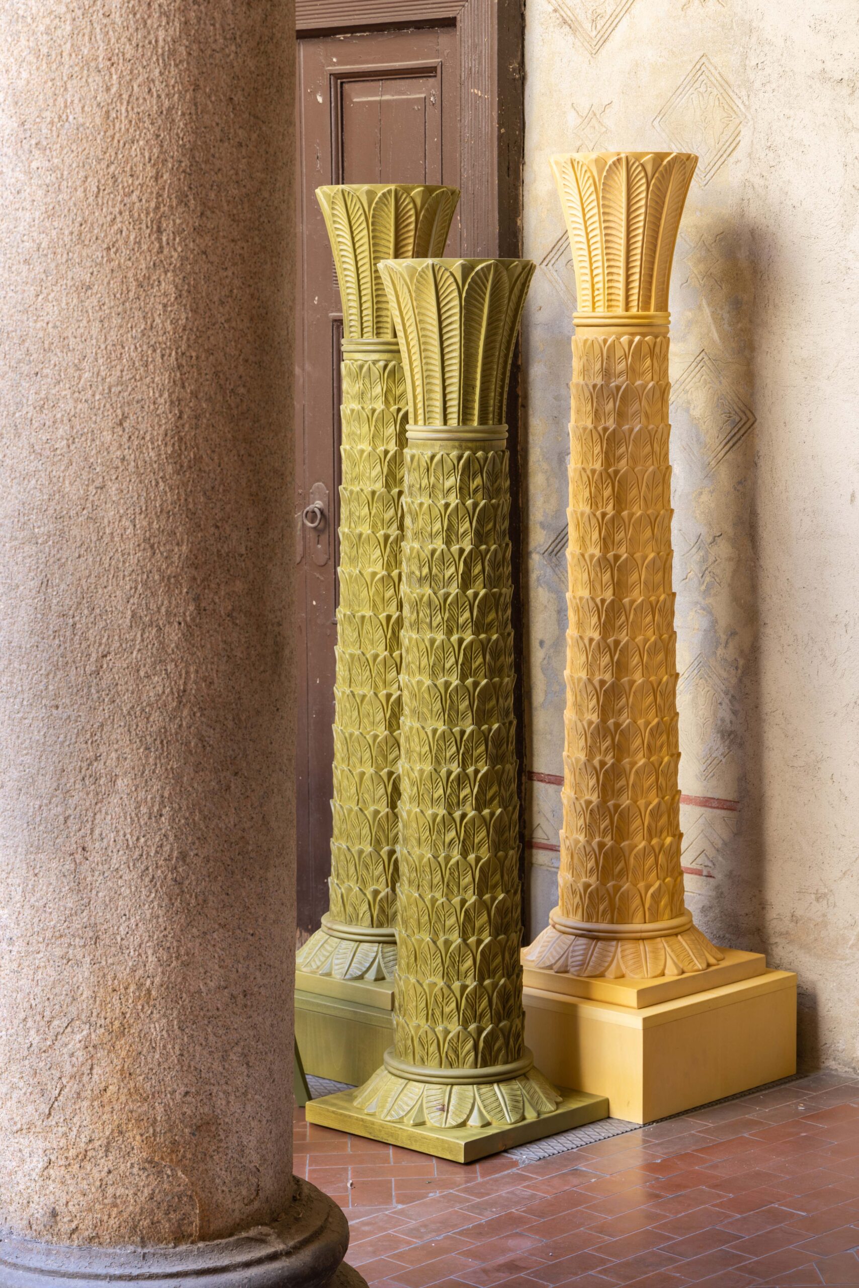 La fonte di ispirazione di questo prodotto sono le colonne Art Deco in voga negli anni ’20, mentre gli elementi intagliati vengono dalle foglie di tradizione rinascimentale e dalla Palmette usata come decoro nell’Antico Egitto.